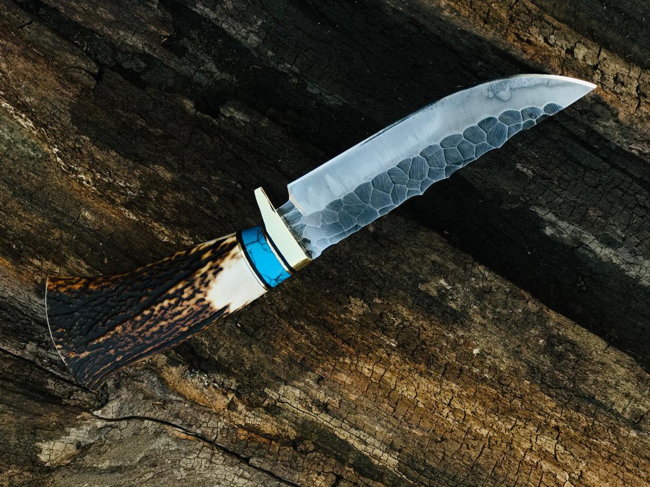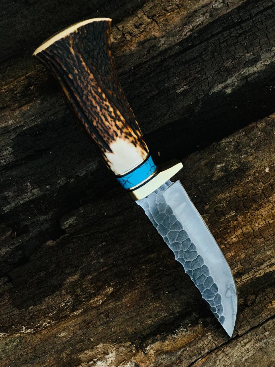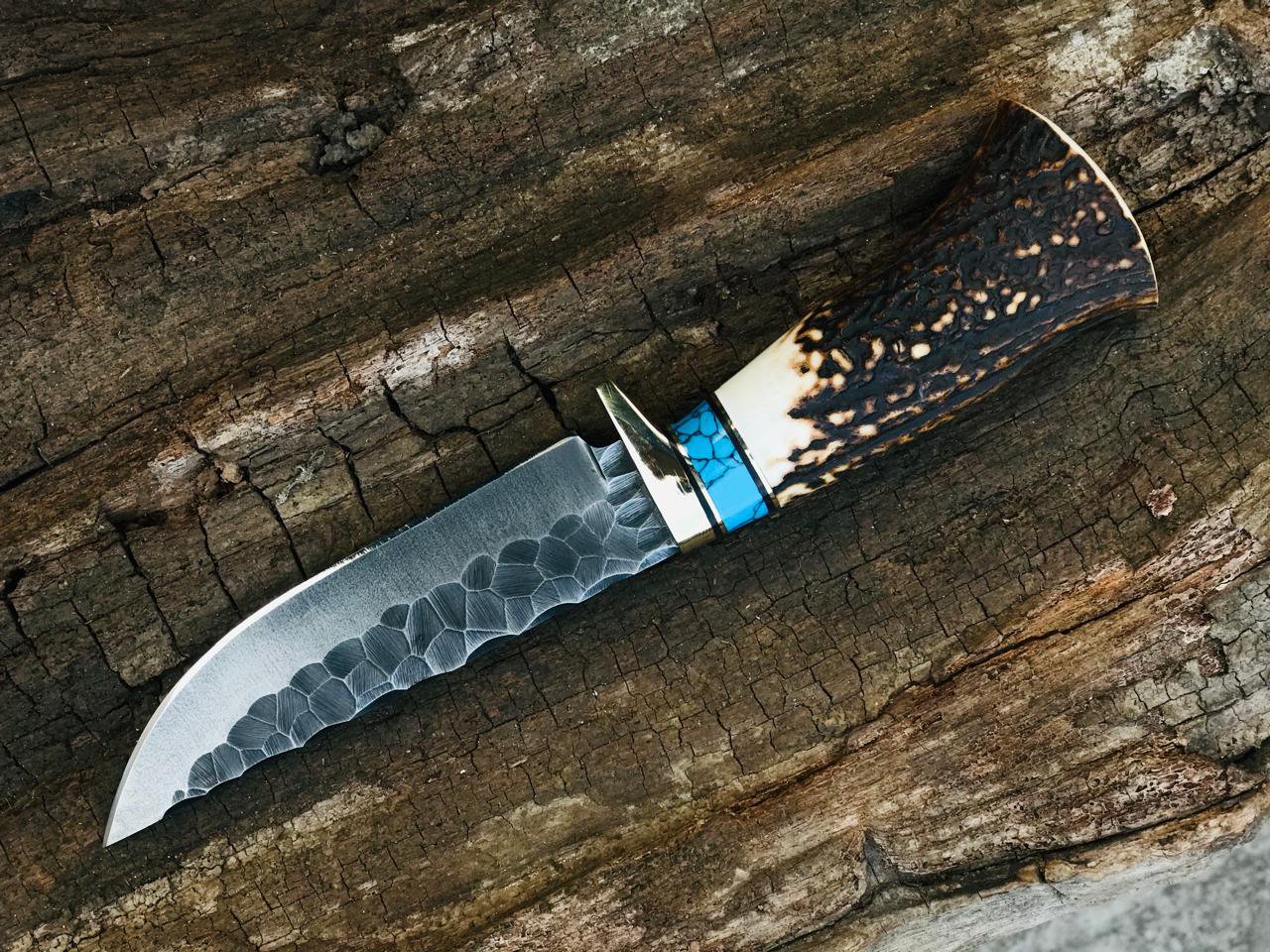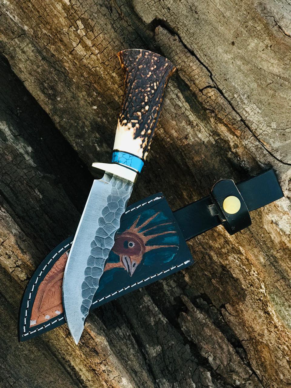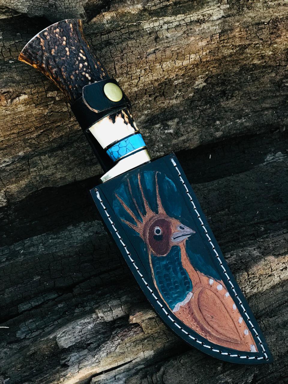 The handle is crafted from genuine stag horn, offering a natural grip and rugged beauty that makes every knife unique. A turquoise spacer and polished guard create a striking contrast, giving the knife both power and refined style.