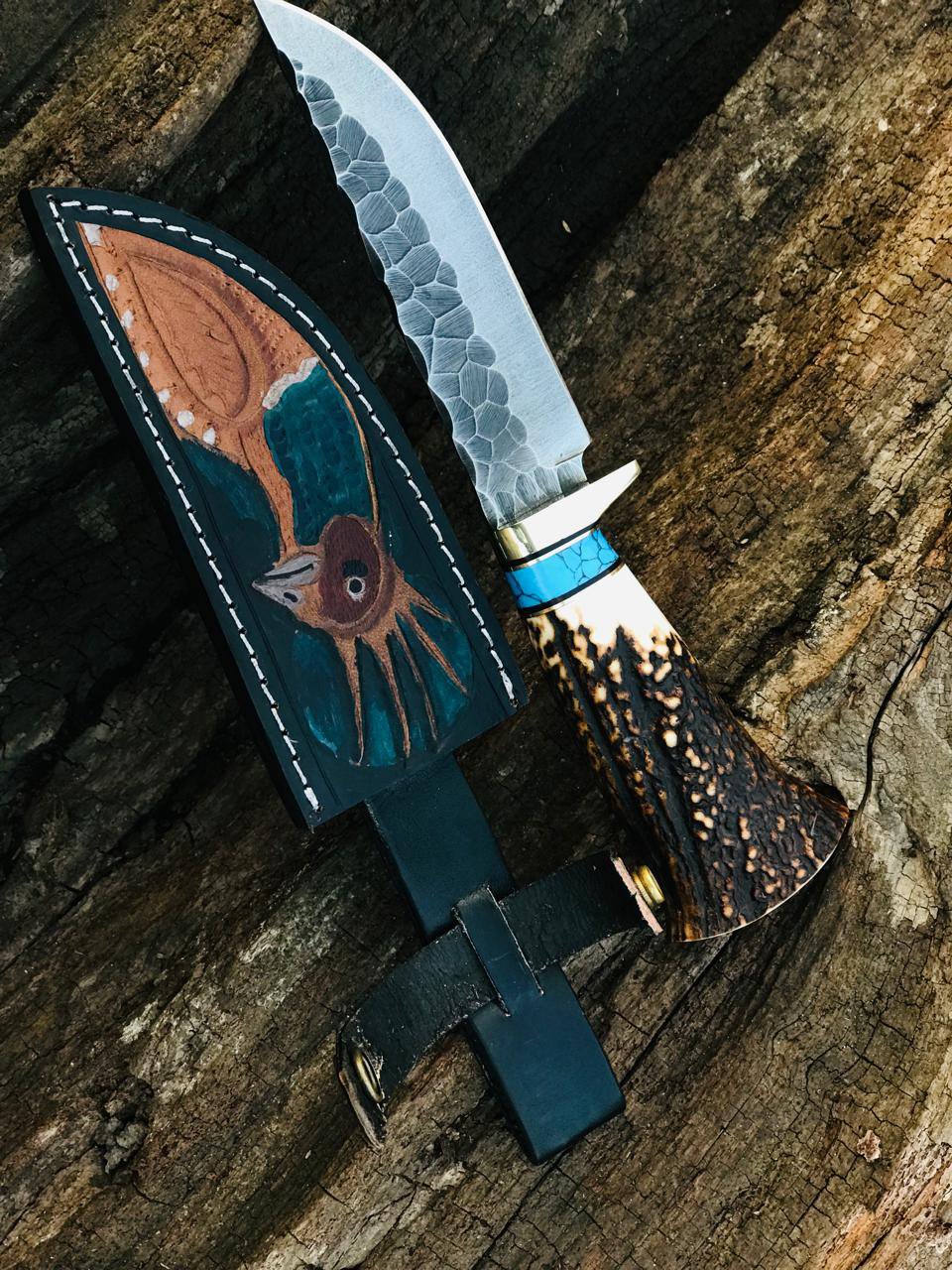 Paired with a handcrafted leather sheath featuring a detailed wildlife design, this knife stands as a symbol of authentic craftsmanship—made for hunters, outdoorsmen, and collectors who appreciate strength, reliability, and timeless design.
