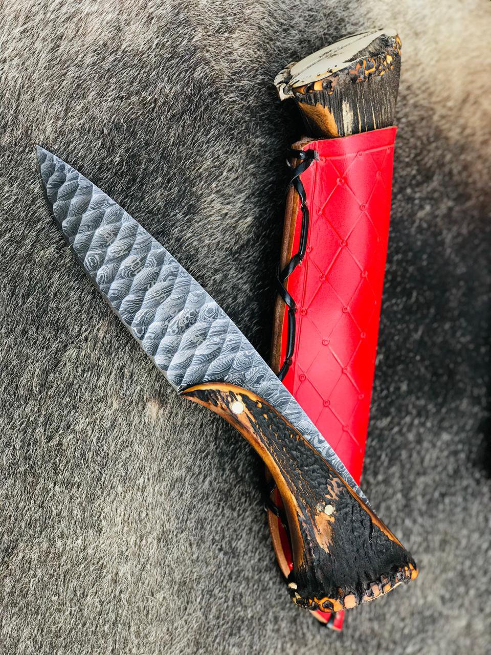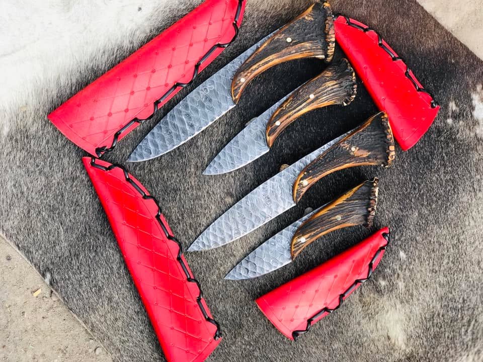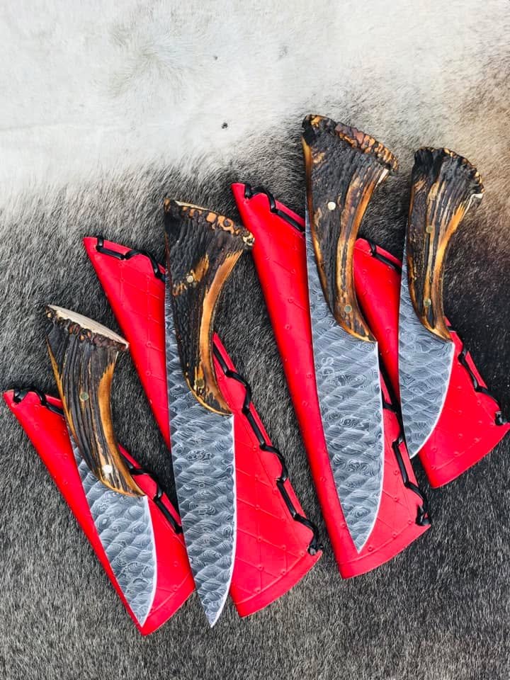 Each knife comes with a protective red sheath, designed for safe storage, easy carry, and an enhanced presentation. Ideal for hunting, outdoor use, utility tasks, or display, this set combines functionality with a refined handcrafted finish.