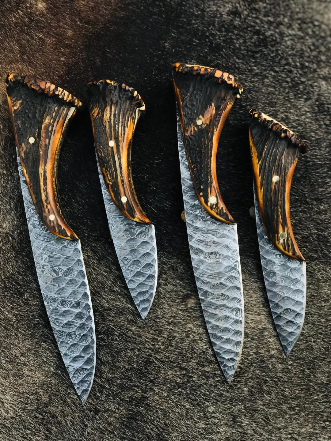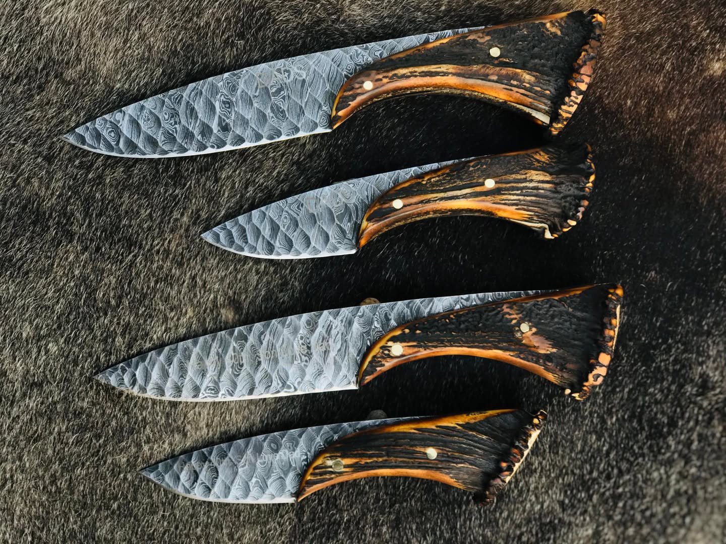 The knives are fitted with genuine natural antler handles, carefully shaped for a comfortable, secure grip while preserving the organic character of the material. Solid brass pins add strength and reliability to the handle construction.