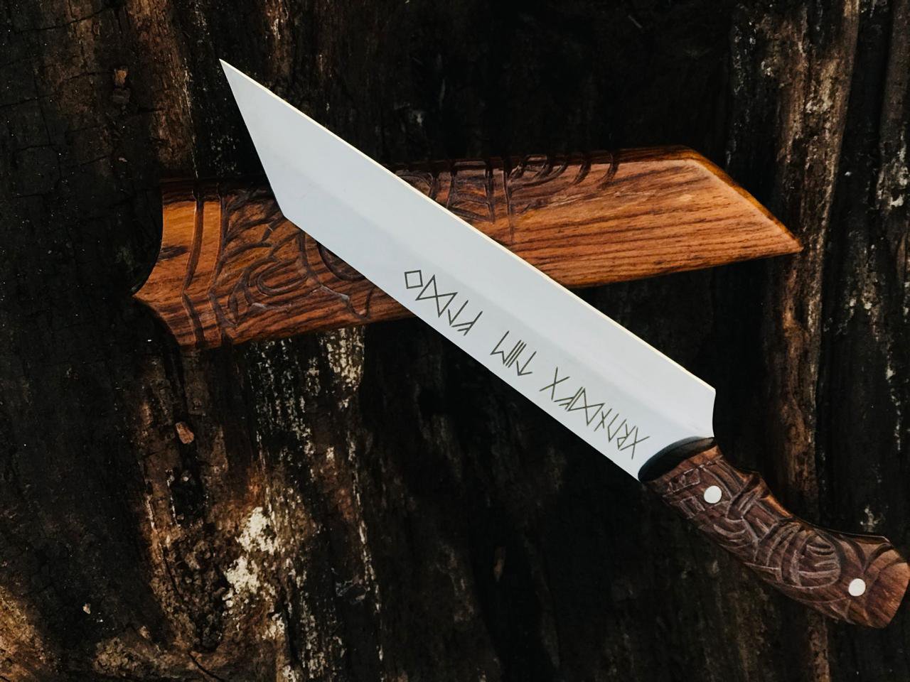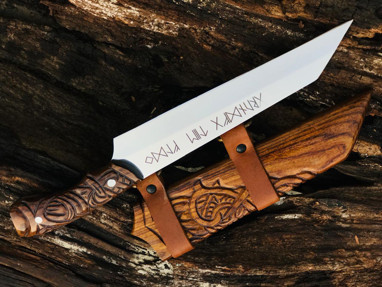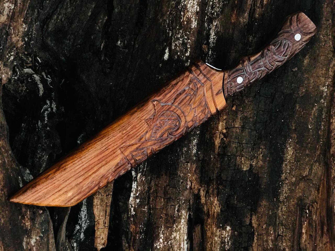 Handmade Bowie Viking-Style Knife, featuring a meticulously hand-engraved wooden handle and a matching wooden scabbard. MZ:13