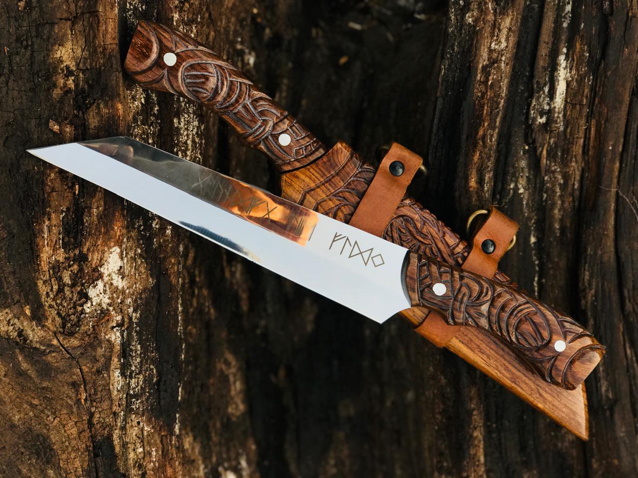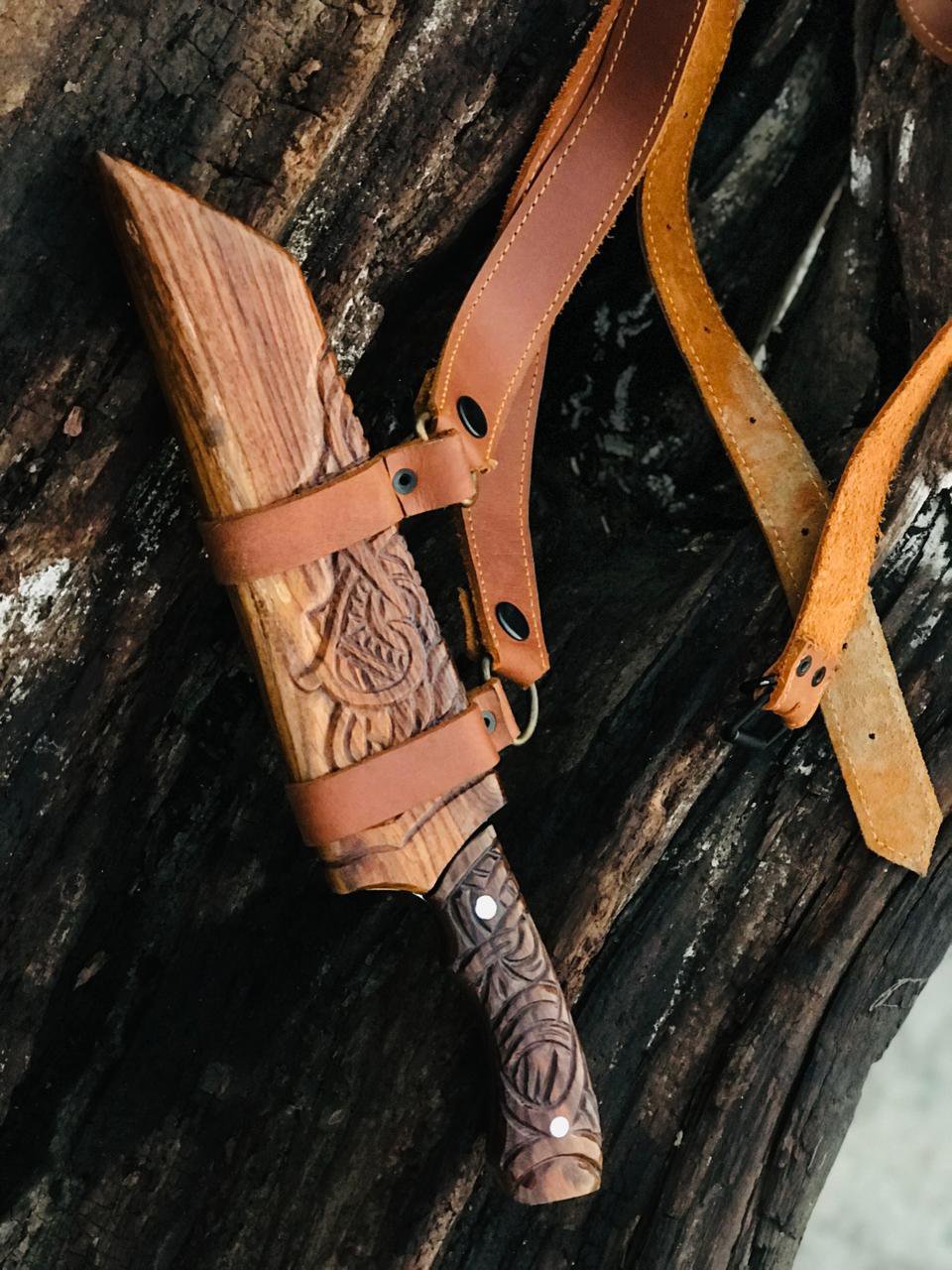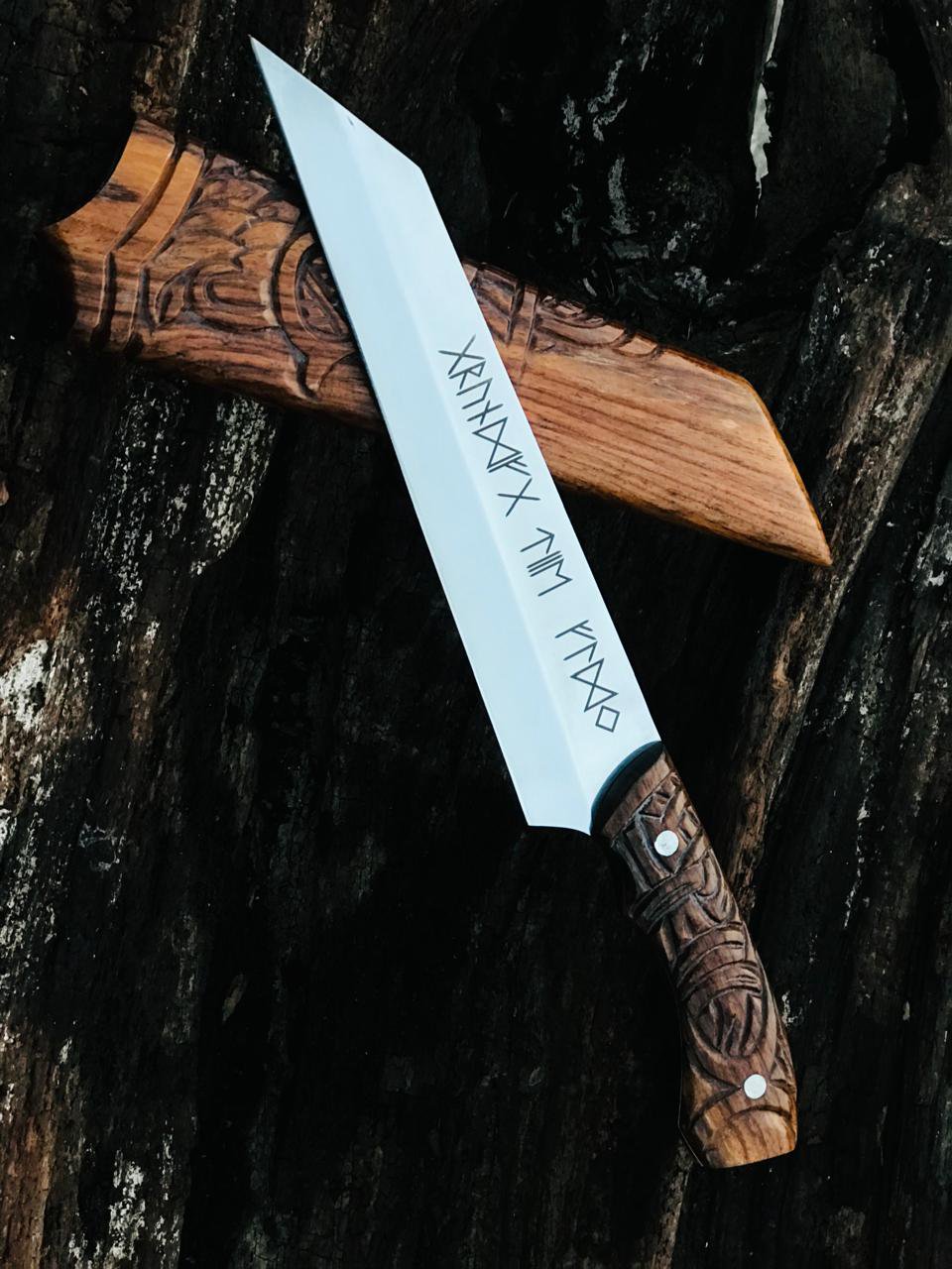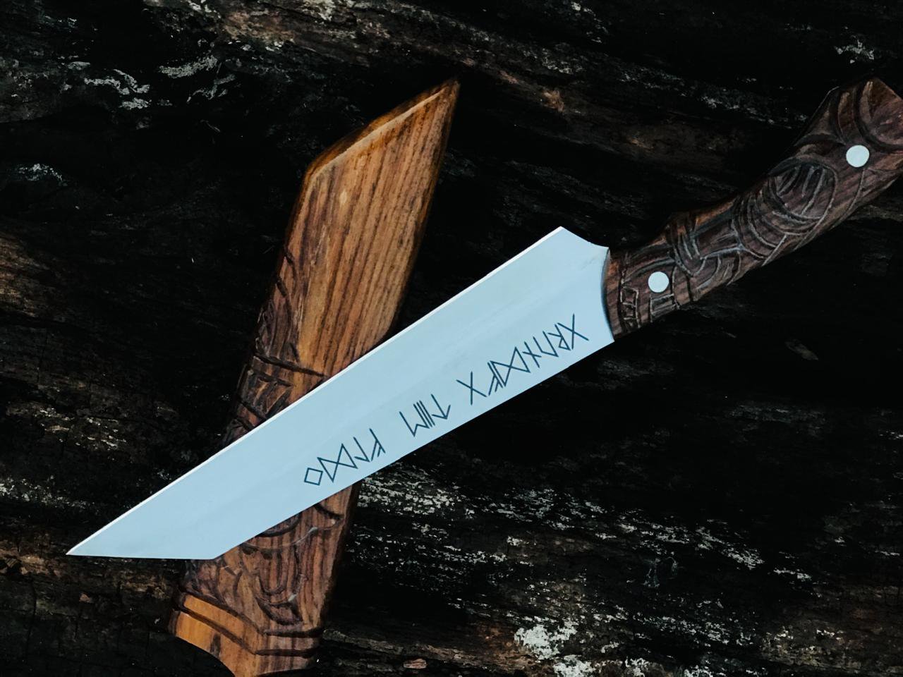 Handmade Bowie Viking-Style Knife, featuring a meticulously hand-engraved wooden handle and a matching wooden scabbard. MZ:13