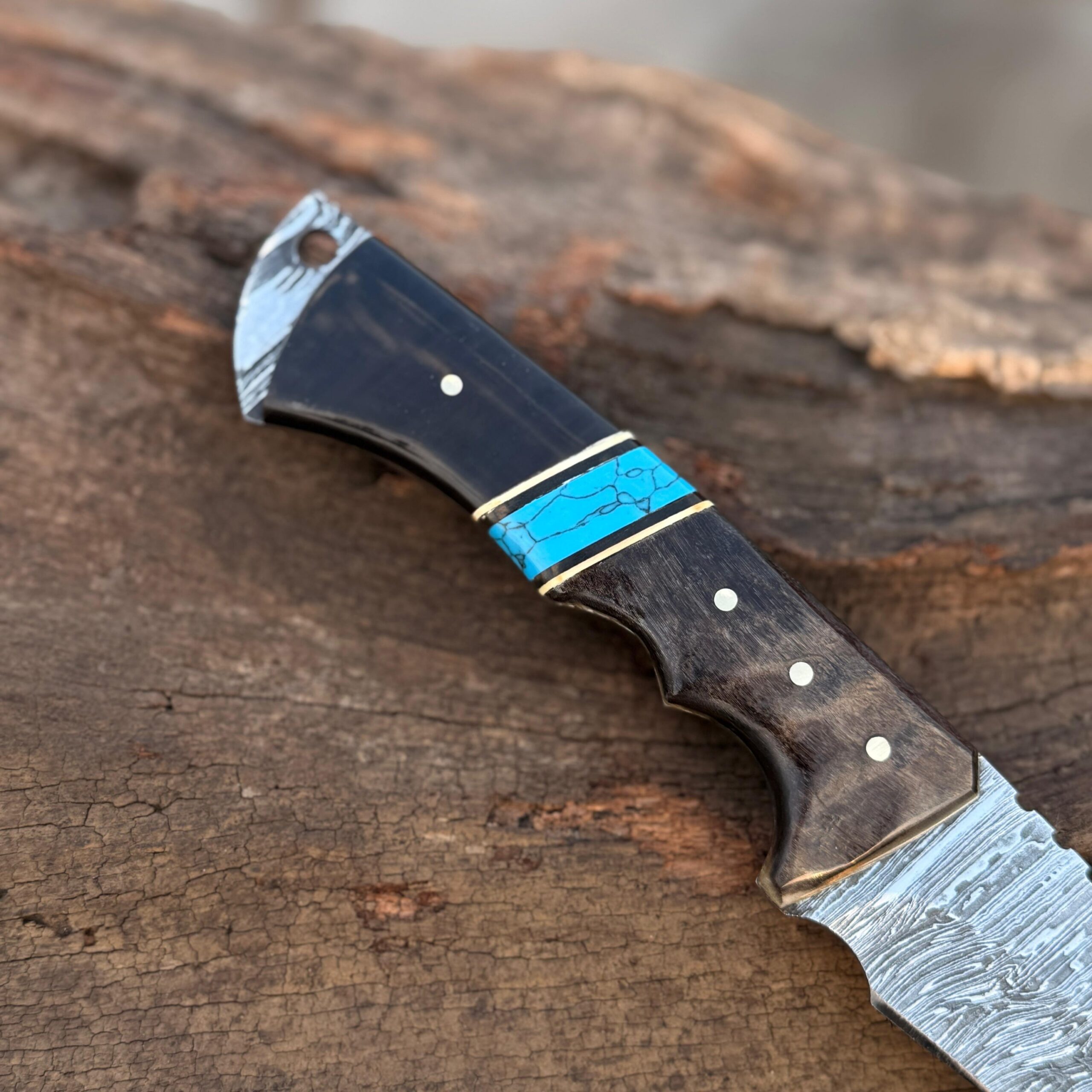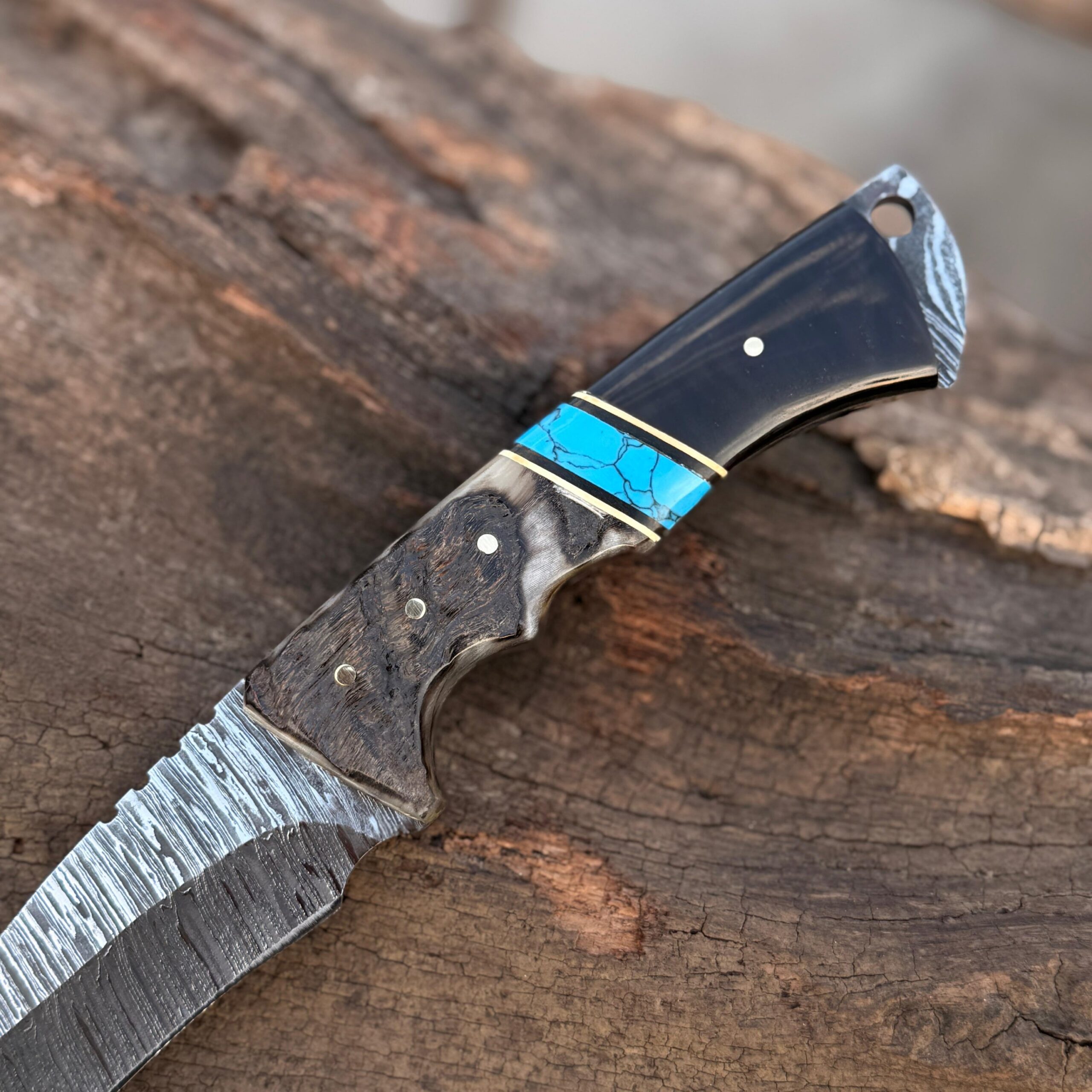 With an overall length of 11 inches, this knife offers perfect balance and confident handling. The handle is a striking fusion of buffalo horn, natural stone, and sheep horn, carefully shaped for comfort, durability, and a one-of-a-kind appearance. Each material is hand-selected, making every knife truly unique.