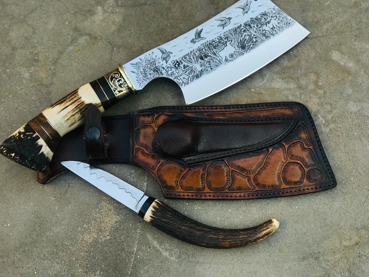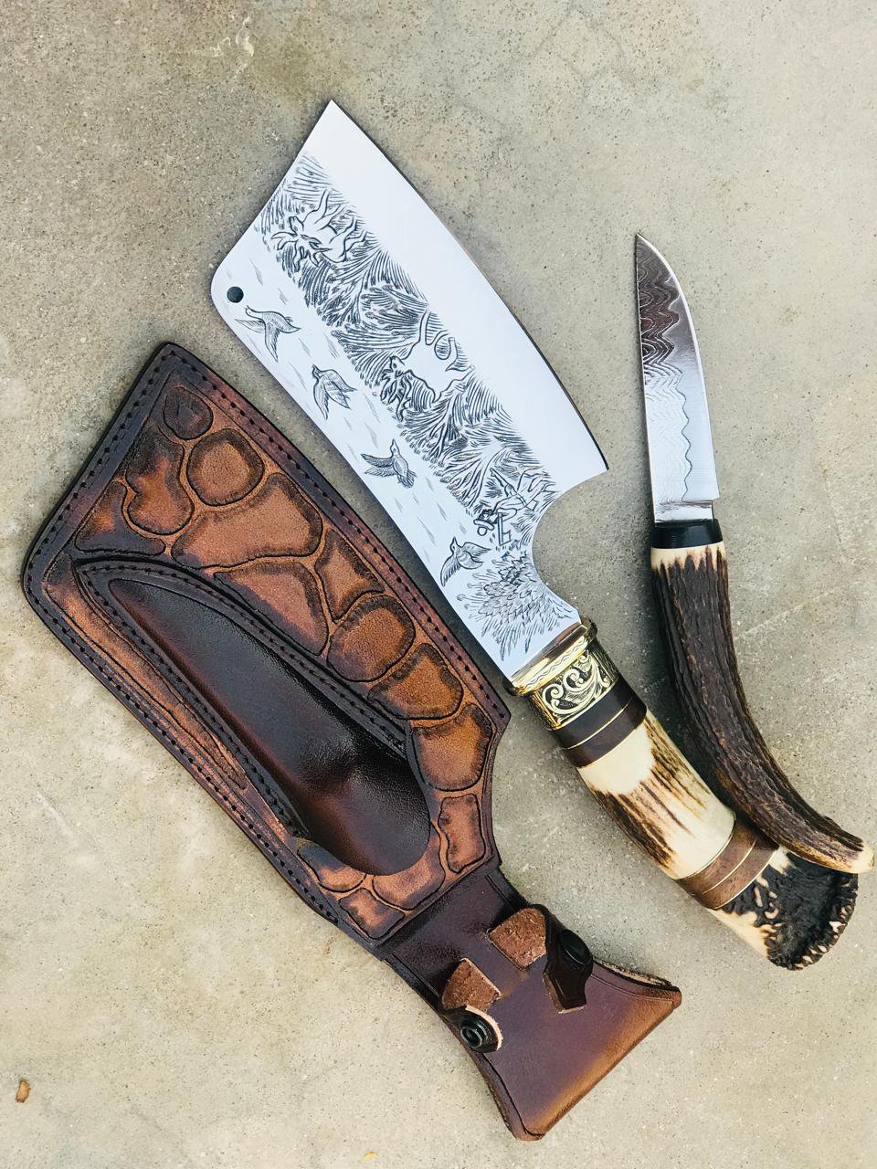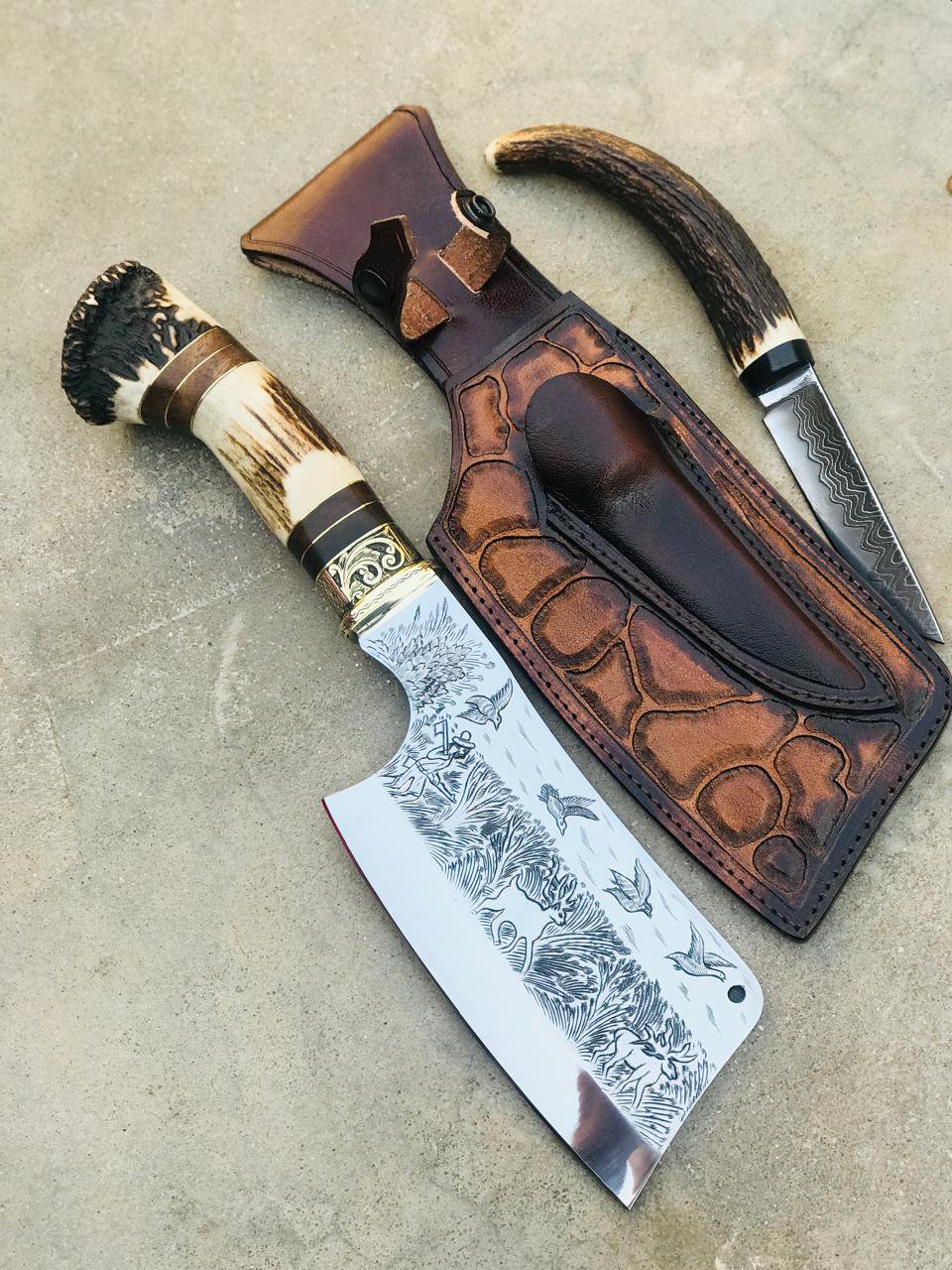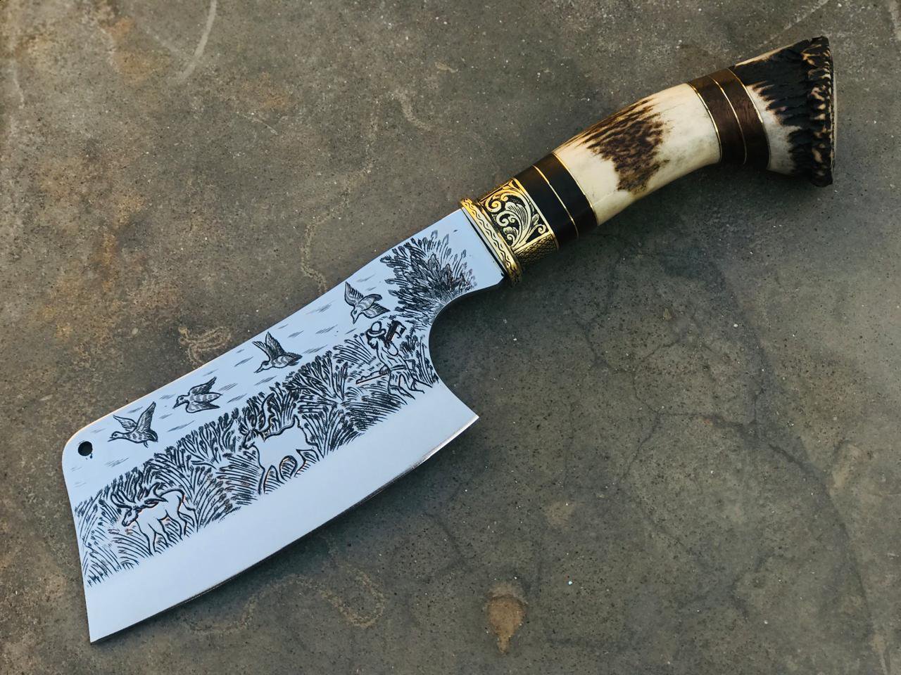 This premium knife set features a hand-engraved cleaver crafted from high-quality steel, designed to deliver real performance while showcasing traditional craftsmanship. The wide cleaver blade is fully functional and built for serious cutting tasks, paired with detailed hand engraving for a bold, custom look.