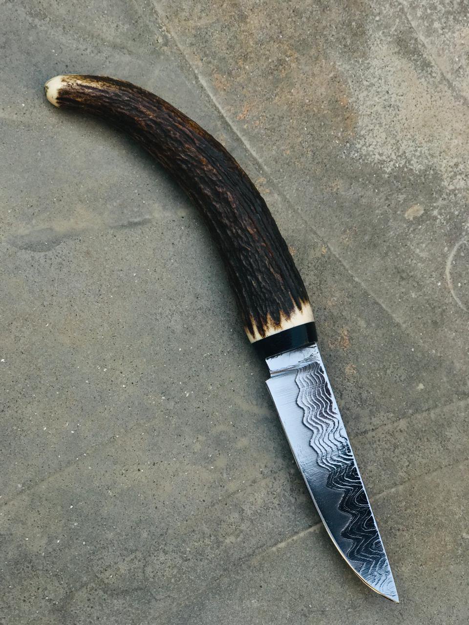 The cleaver is finished with a hand-engraved brass guard and a genuine antler handle, offering excellent balance, grip, and natural character. Each antler handle is unique, making every piece one of a kind.